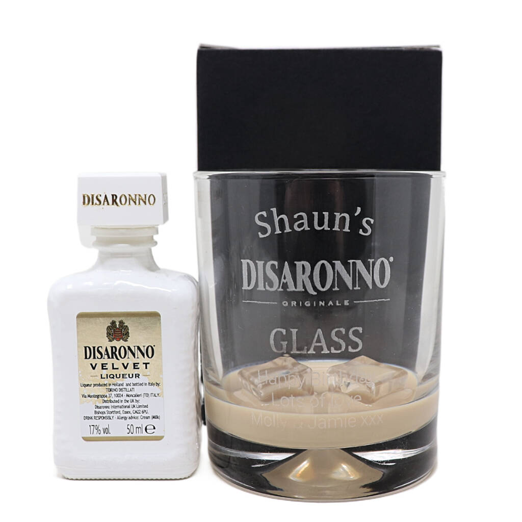 Personalised Disaronno Design Glass Tumbler And 5cl Miniature Disaronno Velvet Cream Liqueur