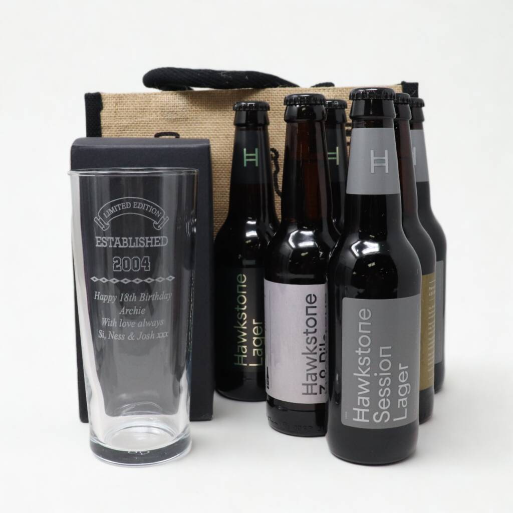 Personalised Pint Glass And Six Bottles Of Hawkstone Beer Gift Set Established Birthday Design