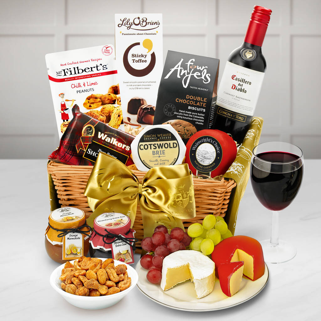 The Downton Hamper with Red Wine is a delightful gift of Chilean wine and British cheeses plus a host of savoury and sweet treats.