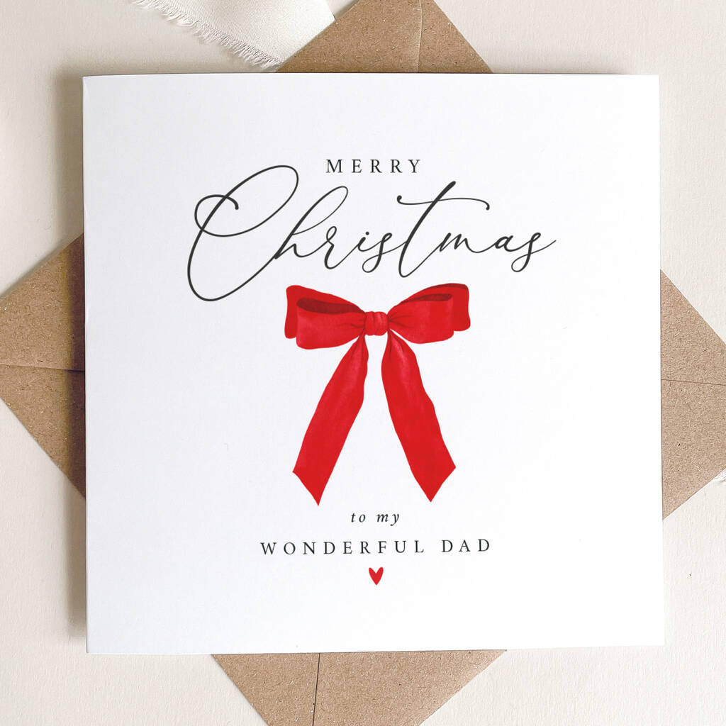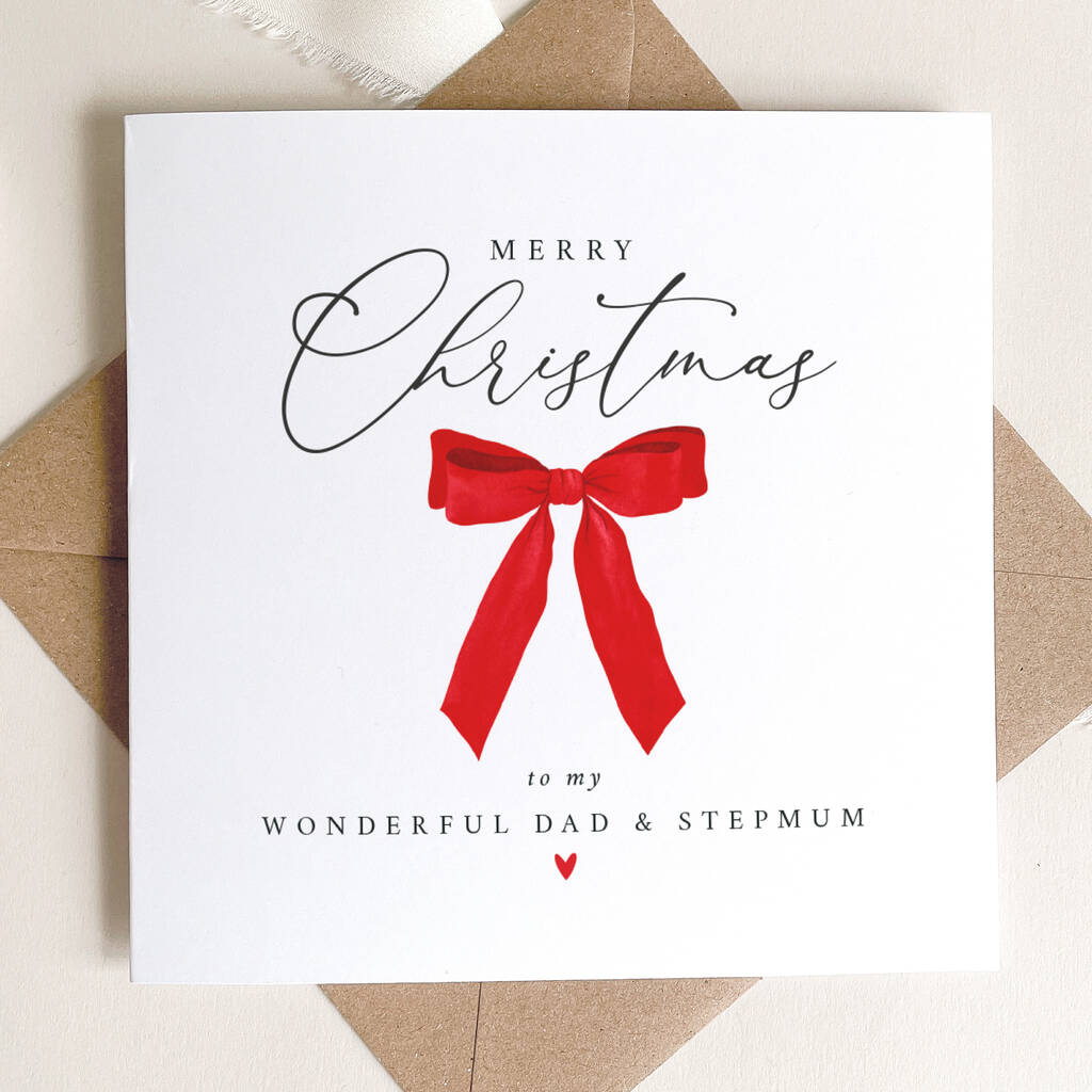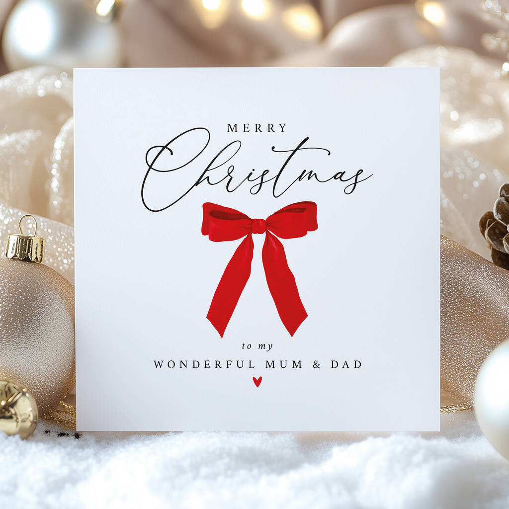 Christmas Card For Mum And Dad, Mum, Dad And Step Parents: Festive Red Bow And Red Heart Design