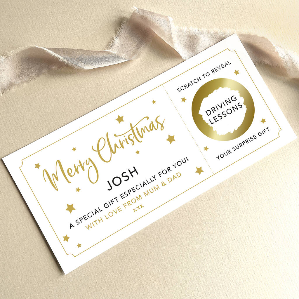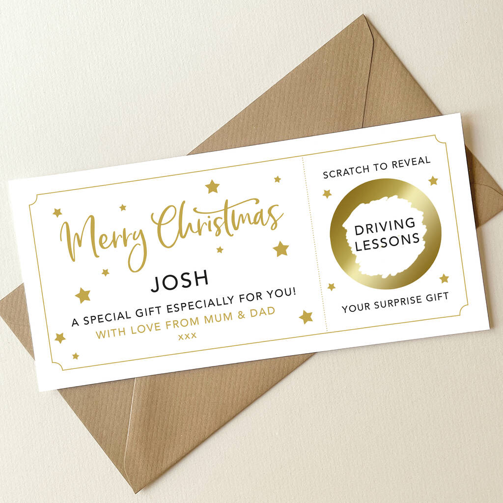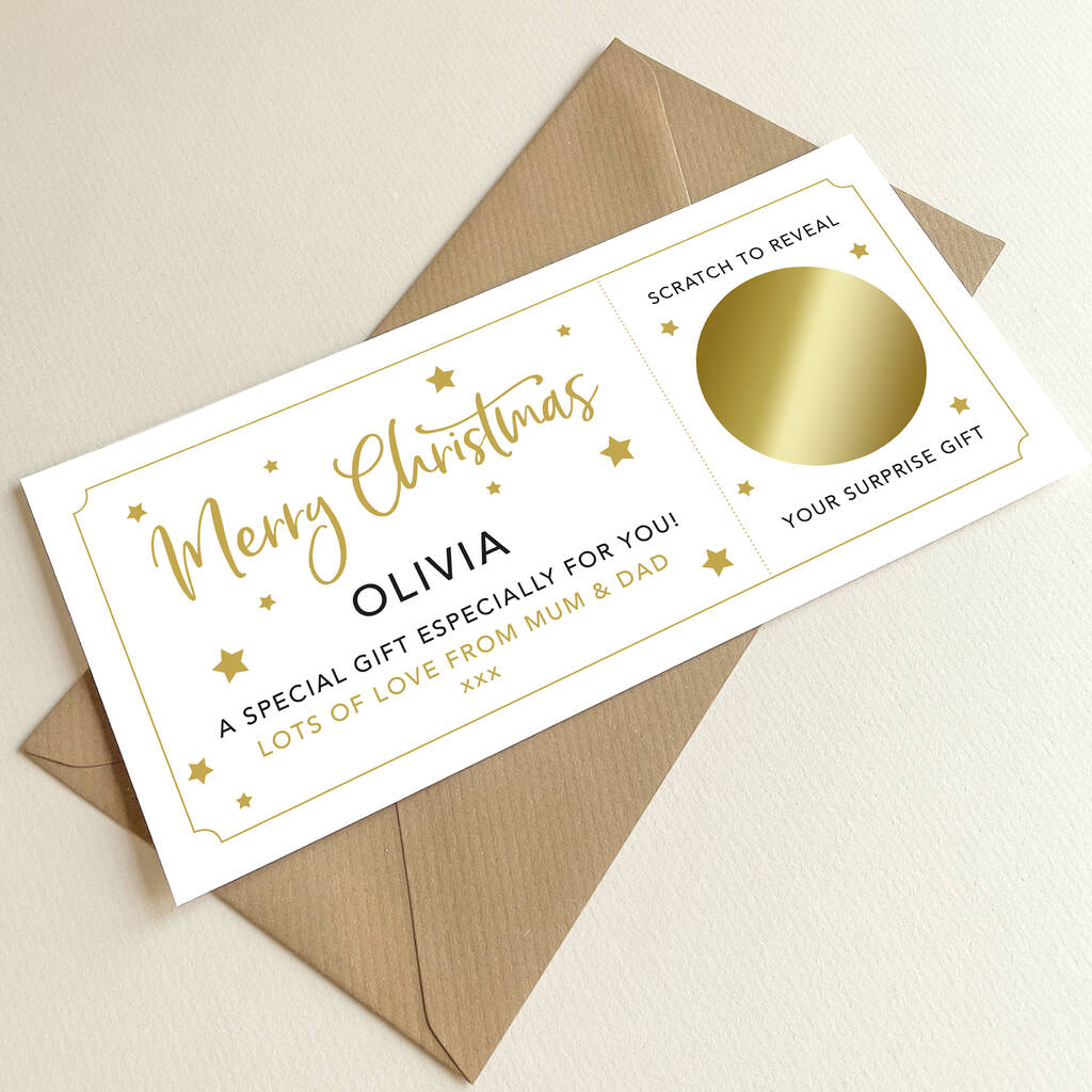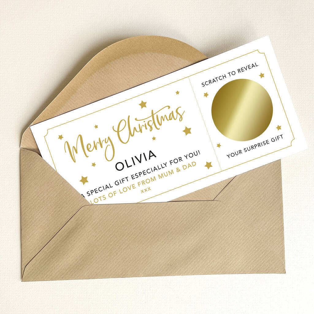 Personalised Christmas Surprise Scratch Card: Stars And Gold Circle Design