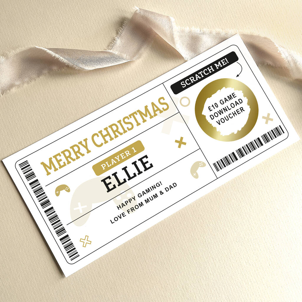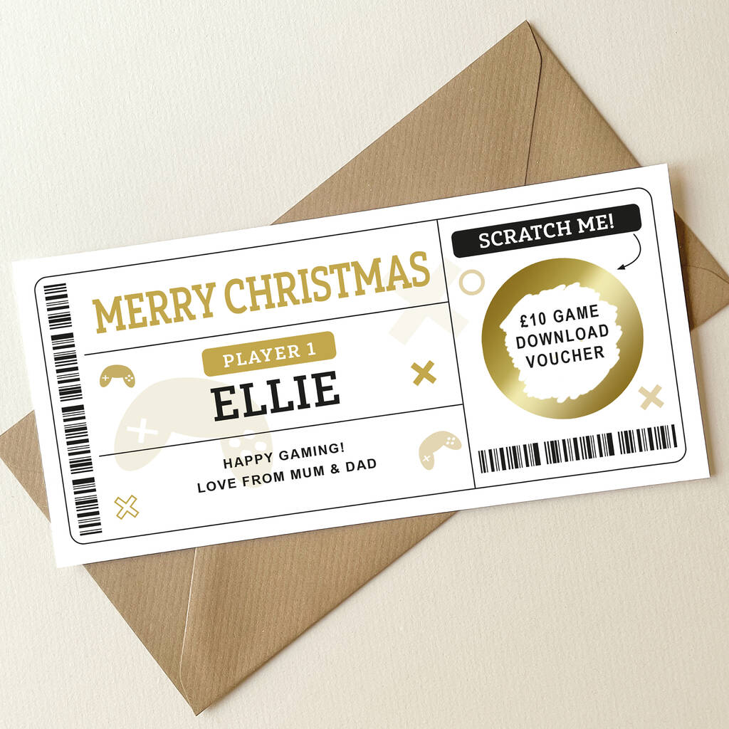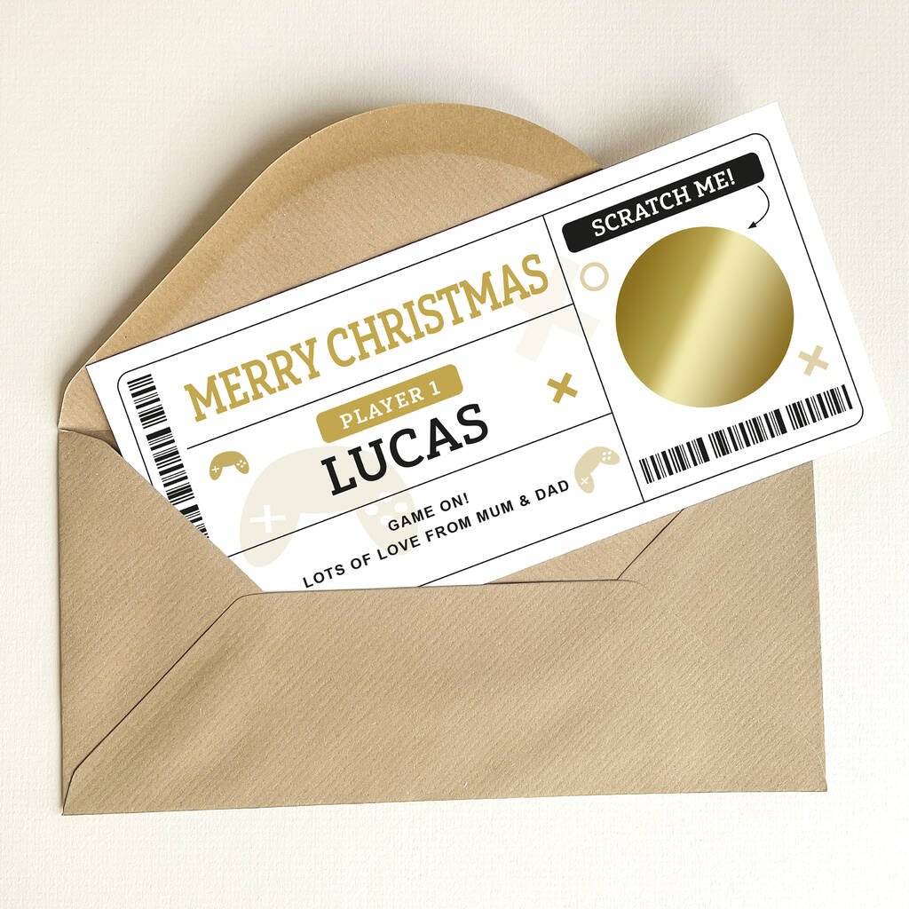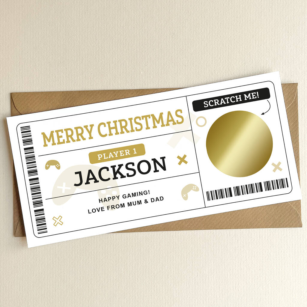 Personalised Gamer Scratch Card Christmas Voucher: Gold Circle Design