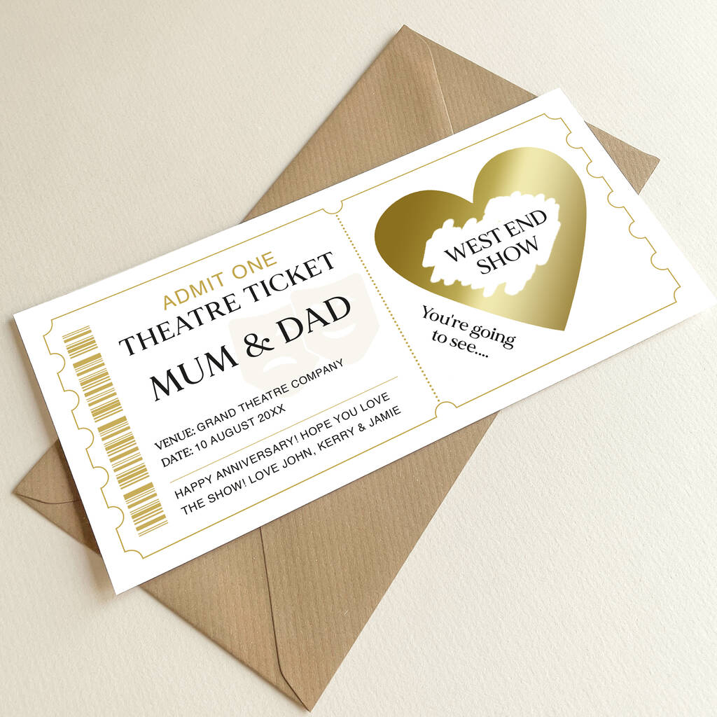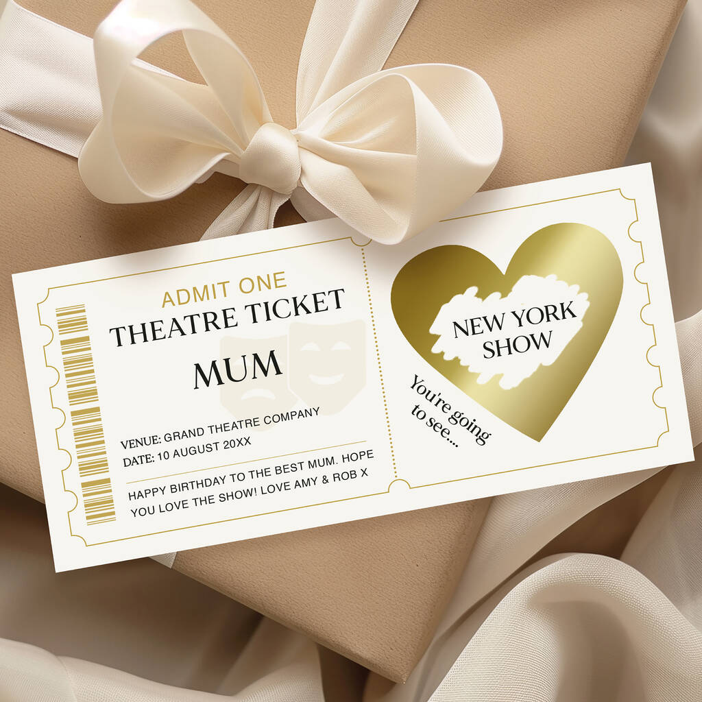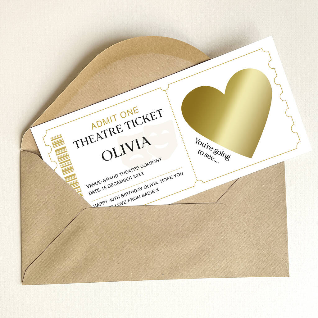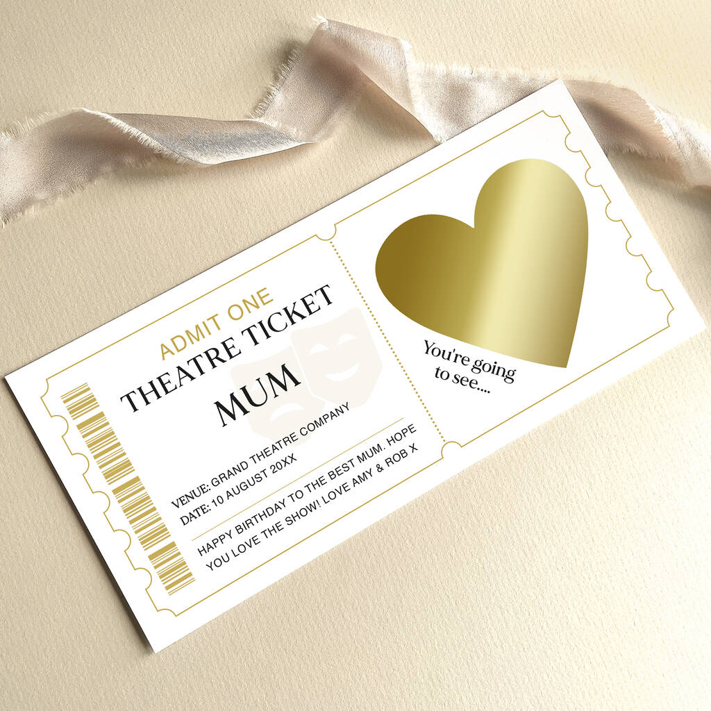 Personalised Theatre Ticket Scratch Card: Theatre Masks And Gold Heart Design