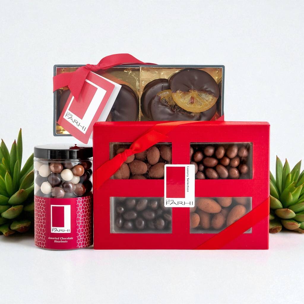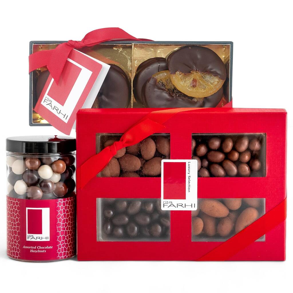 CHOCOLATE COATED NUT: Milk Chocolate (65%)(Sugar, Full Milk Powder, Cocoa Butter, Cocoa Mass, Emulsifier: Soya Lecithin, Flavouring), Almonds (25%), Cocoa Powder, Flavouring. Milk chocolate contains Cocoa Solids 30% minimum, Milk solids 20% minimum. Dark Chocolate (70%) (Sugar, Cocoa Mass, Cocoa Butter, Emulsifier (Soya Lecithin), Flavouring), Pistachio(29.1%)(Pistachio, Salt) Glazing Agents (Gum Arabic, Corn (Maize) Protein). Dark Chocolate contains Cocoa Solids 64% min.Milk Chocolate (65%)(Sugar, Full Milk Powder, Cocoa Butter, Cocoa Mass, Emulsifier: Soya Lecithin, Flavouring), Pecans (25%), Gianduja (10%)(Sugar, Hazelnut, Cocoa Butter, Whole Milk Powder, Cocoa Mass, Emulsifier: Soya Lecithin), Cocoa Powder, Flavouring. Milk chocolate contains Cocoa Solids 30% min, Milk solids 20% min.