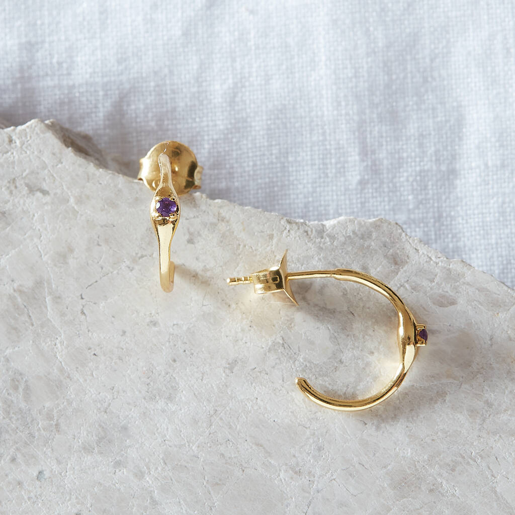 Classic amethyst gemstone set in 18 carat gold and sterling silver in a small hoop earrings style. These wonderfully elegant small hoop earrings would be a lovely asset to anyones jewellery collection. The single yet bold purple amethyst gemstone bursts in colour and character against its gold background, for a simple yet beautiful look.