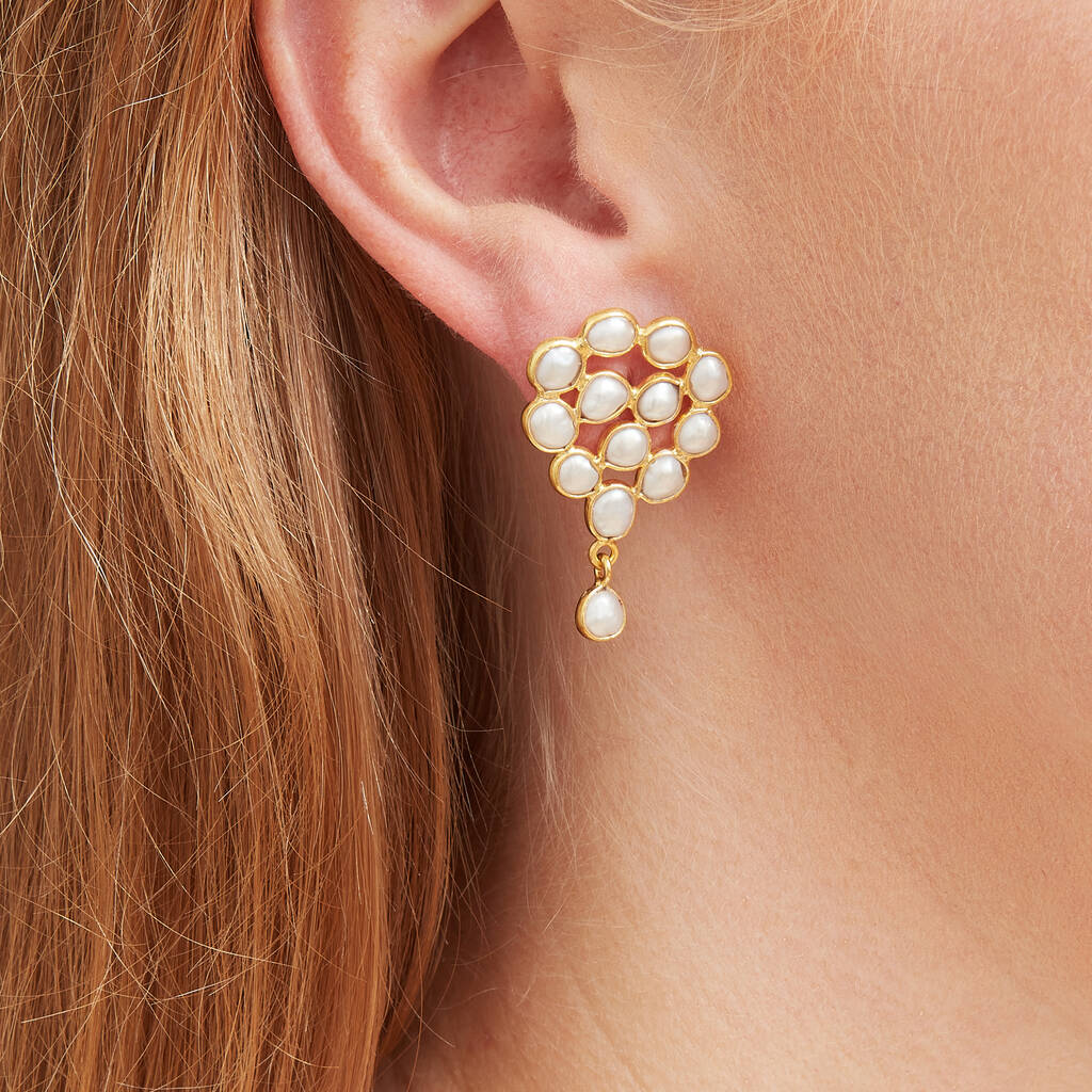 Pearl Cluster Teardrop Shaped Stud Earrings, 18 K Godl Vermeil