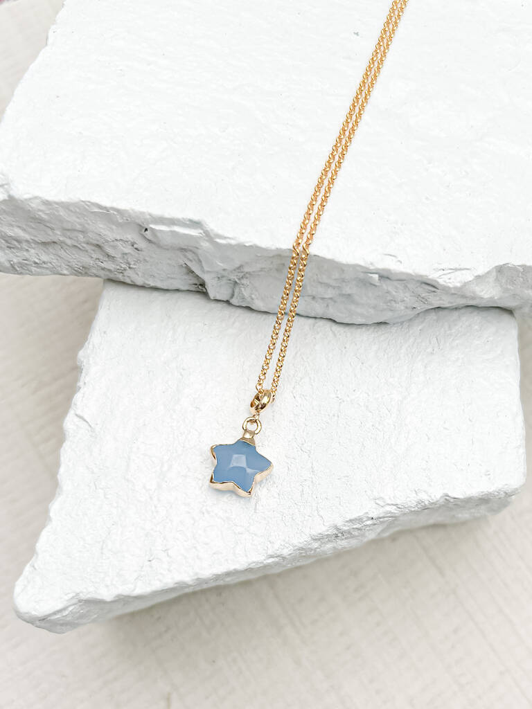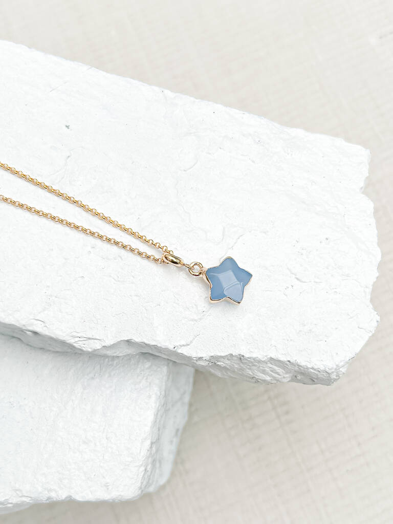 Shine with positive energy with our Agate Star Necklace. A star-shaped grey Agate pendant (17x13mm) rests on a delicate 18k gold-plated chain. Known as a stone of courage, luck, and security, Agate helps bring balance and protection to its wearer. A meaningful gift for Gemini and Virgo signs.✨ DetailsNatural Grey/Blue Agate star pendant (17x13mm)18k gold-plated chain, 17–18 inch adjustableSymbolism: love, courage, luck, protection, harmonyZodiac: Gemini, Virgo. Gemstone variation: Each piece is unique, with natural variations in colour, shape, and pattern.Packaging: Every item comes in a gift pouch with a jewellery display card — ready for retail or gifting.