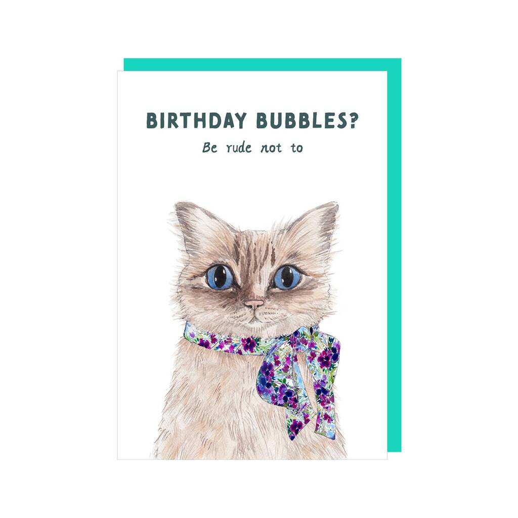 A hand illustrated design of a gorgeous cat dressed in a floral scarf, the caption reads 'Birthday bubbles? Be rude not to'.