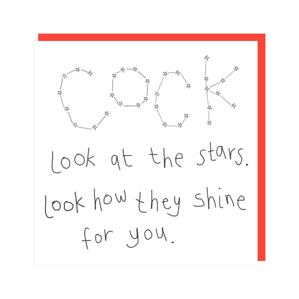 Black and white with a line drawing of a star constellation spelling out the word 'cock'.