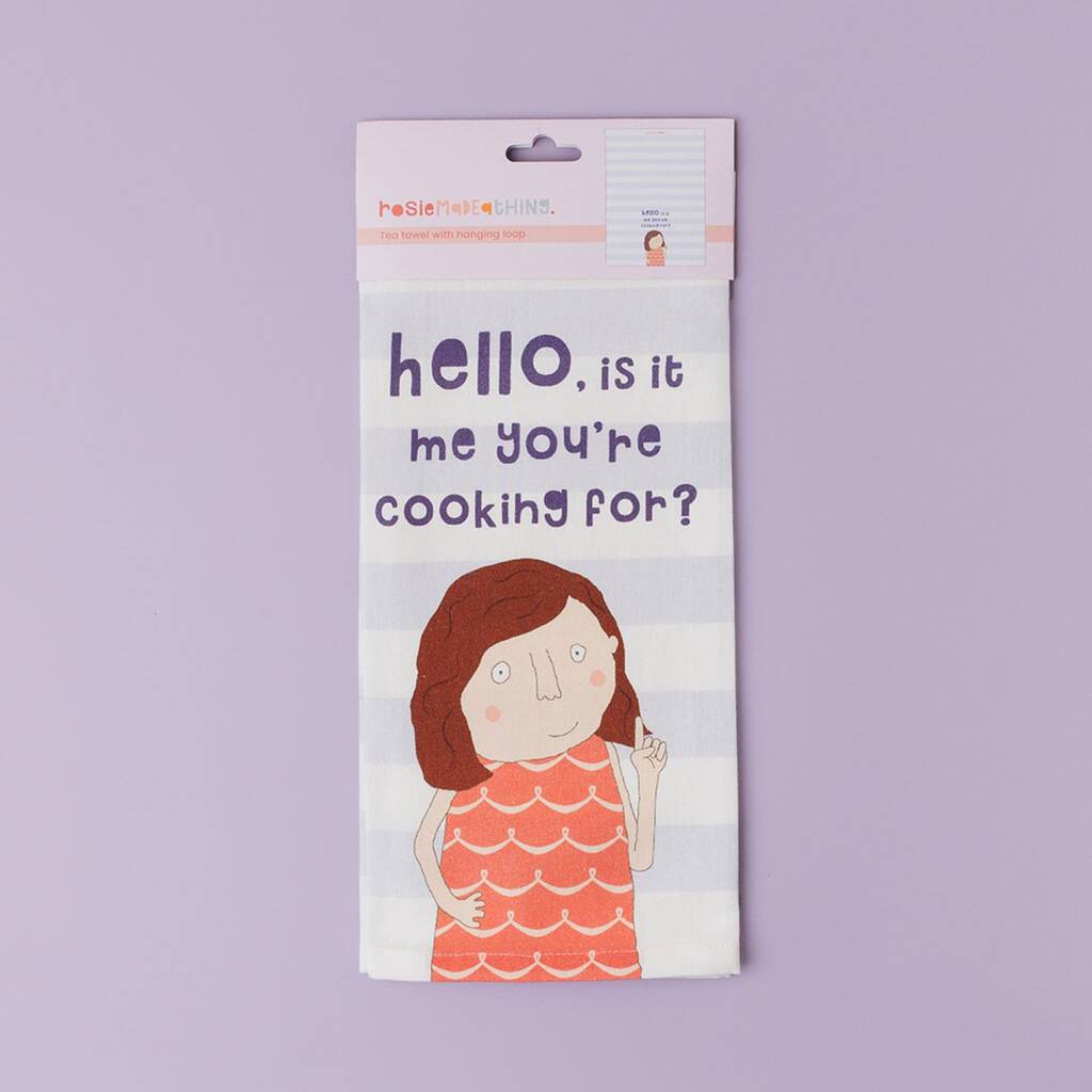 Pale purple and white striped with the wording 'hello, is it me your cooking for?'.