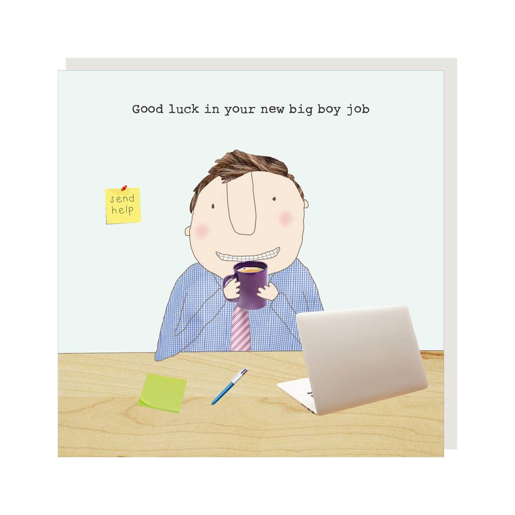 With an image of a man sat at his desk with a cuppa, caption reads 'Good luck in your new big boy job'.