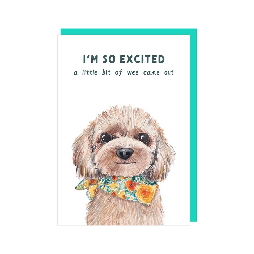 A hand illustrated design of a sweet little dog dressed in a floral scarf, the caption reads I'm so excited a little bit of wee came out'.