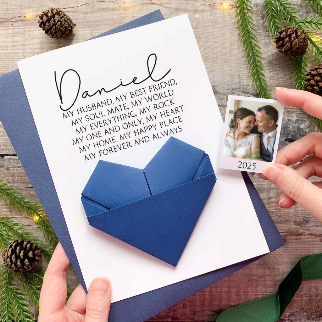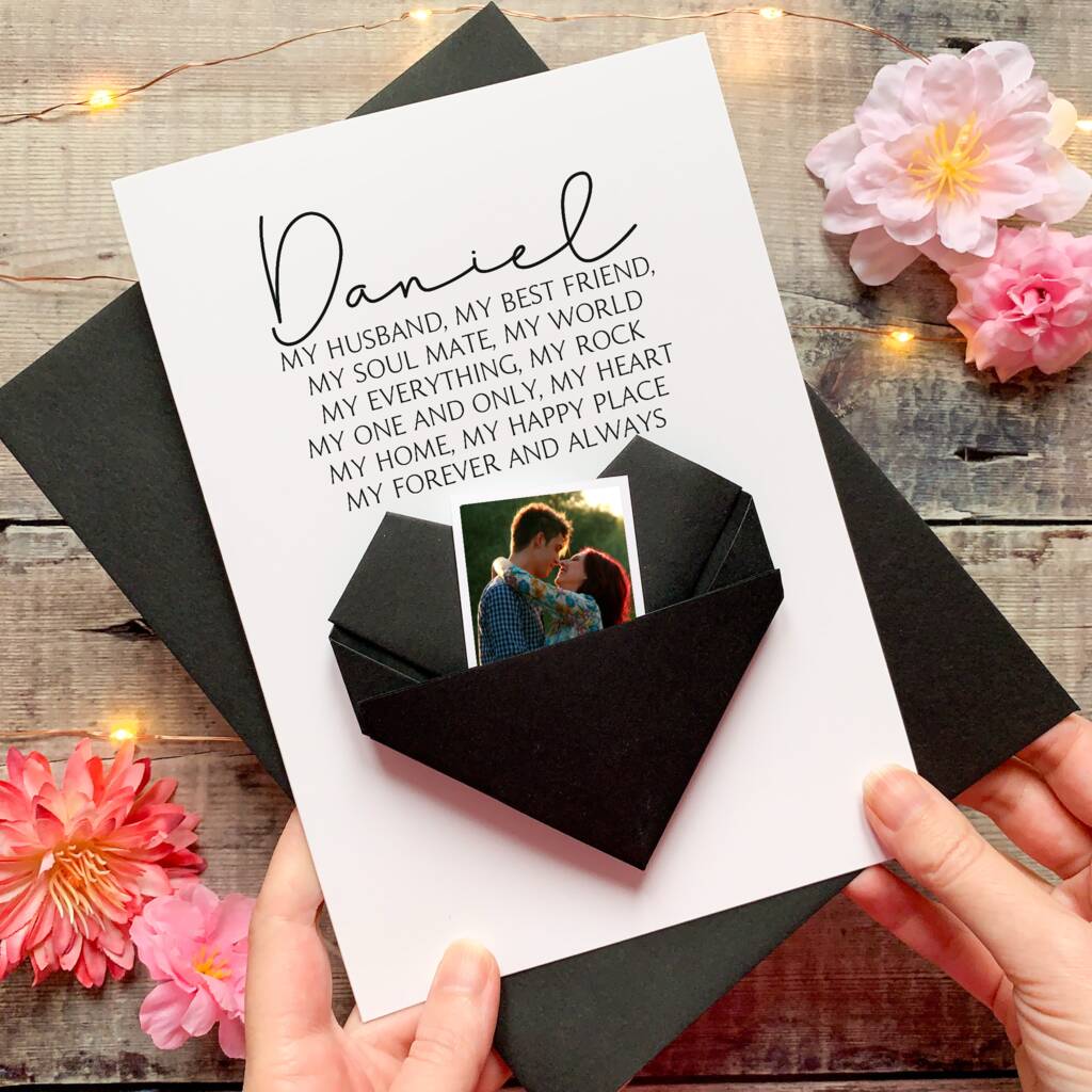 A handmade origami anniversary or birthday card personalised with your husband, wife or partner's name, and a romantic verse.