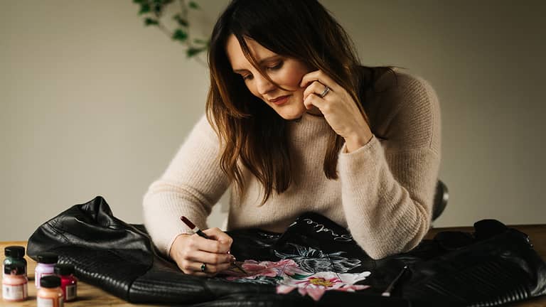 My time working in the fashion industry for a leather wear supplier has given me a great understanding and appreciation of the material. It is durable, wearable and makes for the perfect artist's canvas, complementing the floral designs which "soften" the leather which in turn gives the painted flowers an edge.