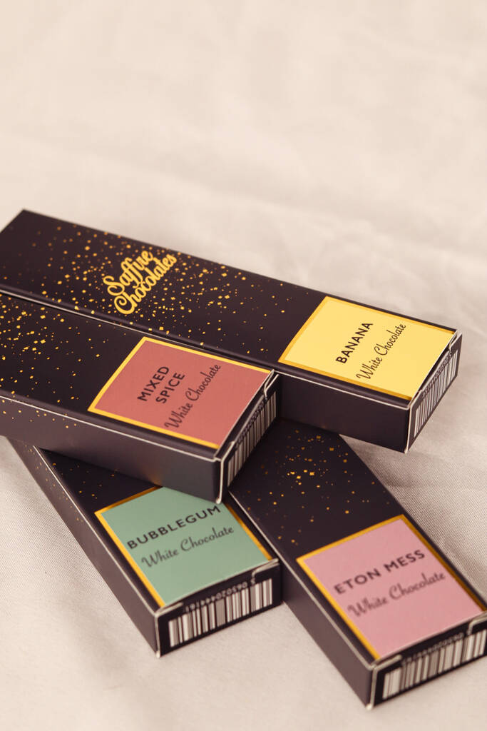 Handmade white chocolate bar available in playful flavours including mixed spice, banana, bubblegum and Eton Mess, perfect for brightening gifts and sweet everyday treats alike.Handcrafted in small batches, this creamy white chocolate bar is made using ethically sourced cocoa butter and carefully selected ingredients for a smooth, luxurious finish. Choose from four joyful flavours: warming mixed spice, fruity banana, nostalgic bubblegum and classic Eton Mess. Each bar is wrapped and finished by hand, making it a thoughtful gift or an indulgent treat for yourself. Perfect for birthdays, thank you presents and letterbox-friendly surprises, this playful flavour selection brings a little fun to artisan chocolate while keeping the quality and care of traditional chocolate making at its heart. Ideal for sharing or savouring slowly too.