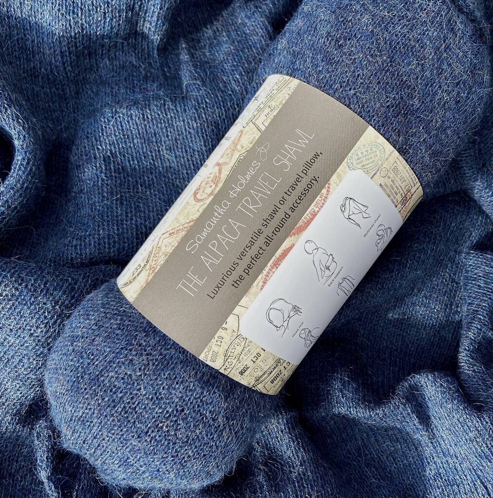 Beautifully made in silky stretchy jersey knit from 100% Alpaca, our alpaca travel shawl is a perfect companion for the discerning traveller, whether on a long haul flight, wedding trip, beach holiday, city break, or night out with friends. It comes pre-rolled in a matching drawstring bag to make a neat little travel pillow, and is presented in a protective card sleeve with pen & ink illustrations to demonstrate the various uses.