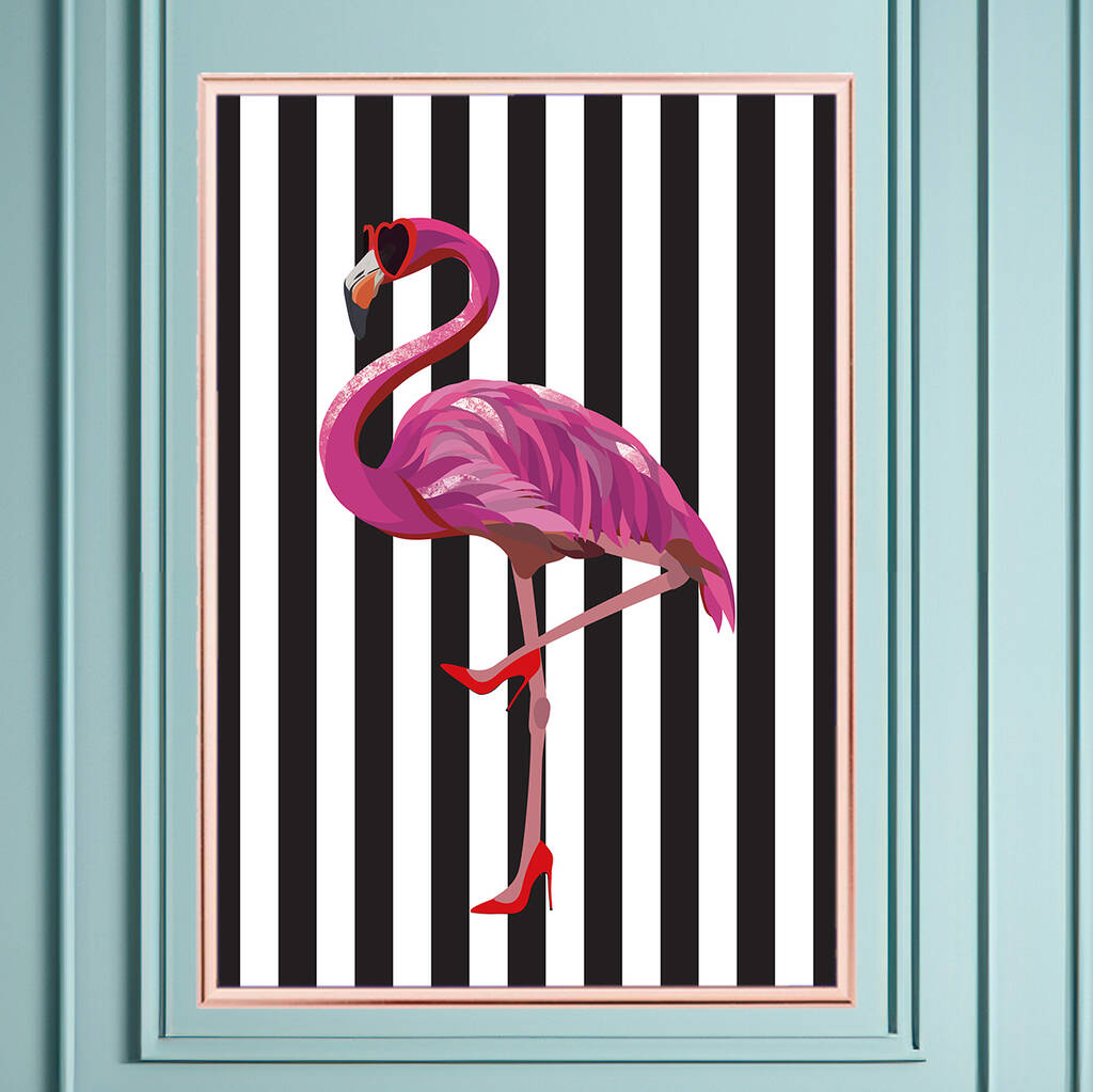 A print of a unique original artwork of a flamingo in heels against your choice of black, white and gold art deco style background!