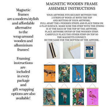 Wooden poster hanger frames - these cheaper frames are solid wood with magnets. The prints slide between the magnets at the top and bottom of the frame. I include instructions for these frames in the package.