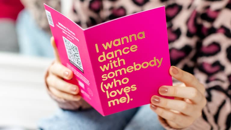 On the front of the card is a song lyric, on the reverse a scannable code activated with a smartphone to instantly enable the recipient unlimited streaming of the song.