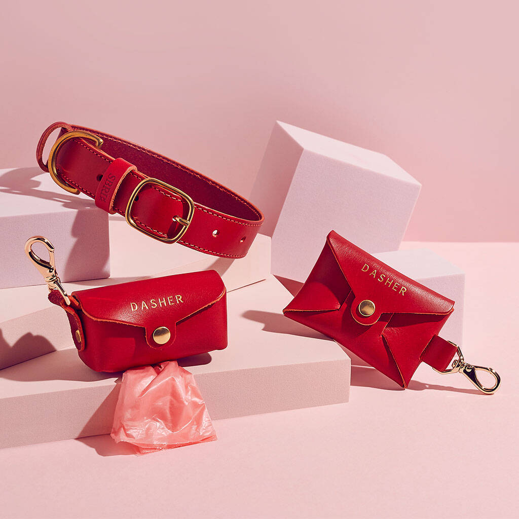 Handmade from sustainably sourced, premium quality British leather and made in the UK, at our studio in the New Forest to be exact. A clever origami design that’s seamless with no need for stitching and held tight by a secure popper. Choose from fuchsia pink, mint green, tan brown, black, lilac, orange or leopard print leather, and personalise with your initials or your dog’s name in gold foil.