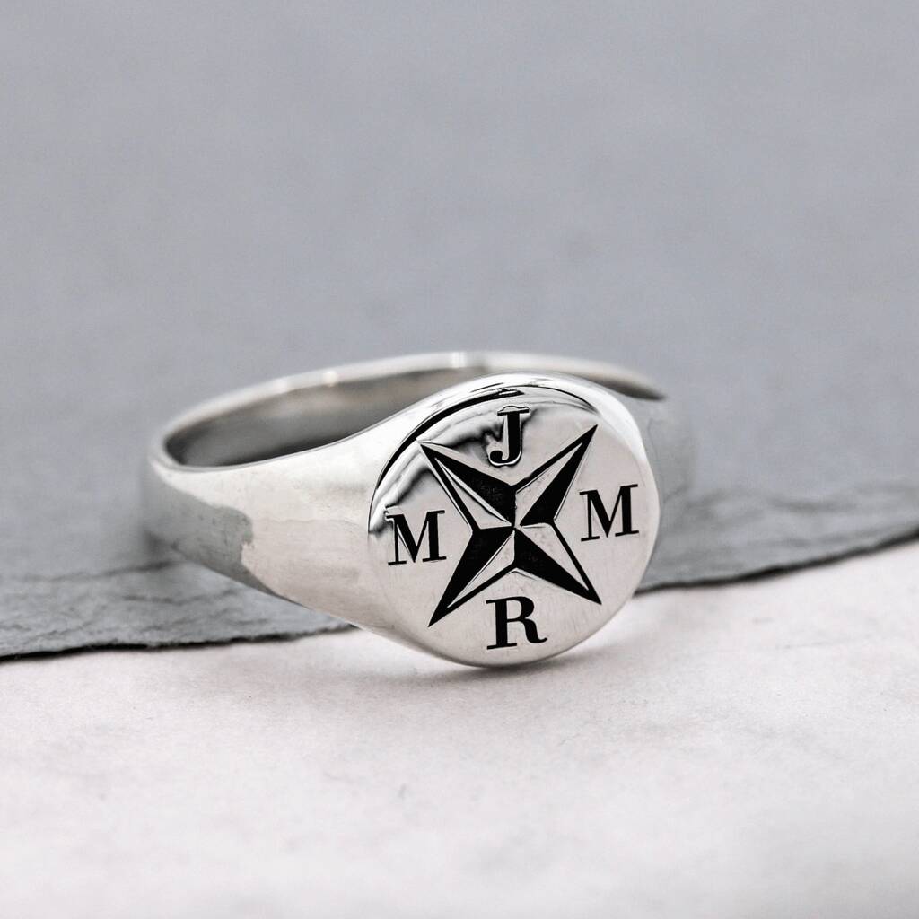 Make an unforgettable statement with this one-of-a-kind silver signet ring, custom-engraved with a cool nautical compass symbol plus your family's initials.