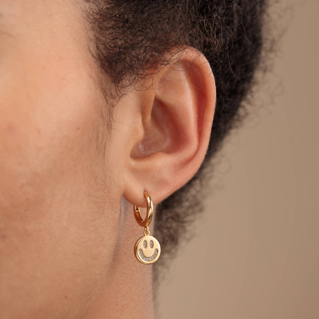 Put a smile on your face with these gold plated smiley face charm hoop earrings.