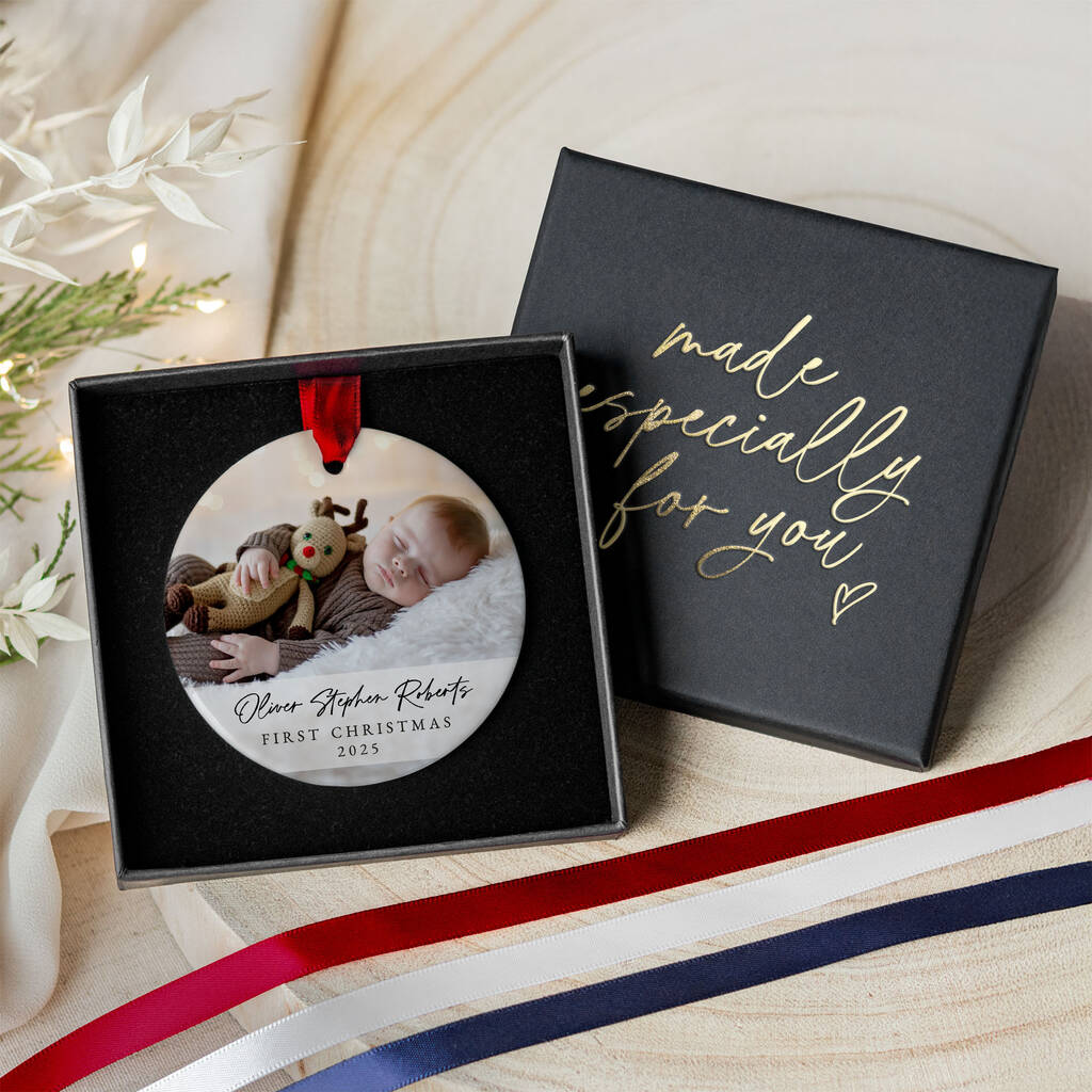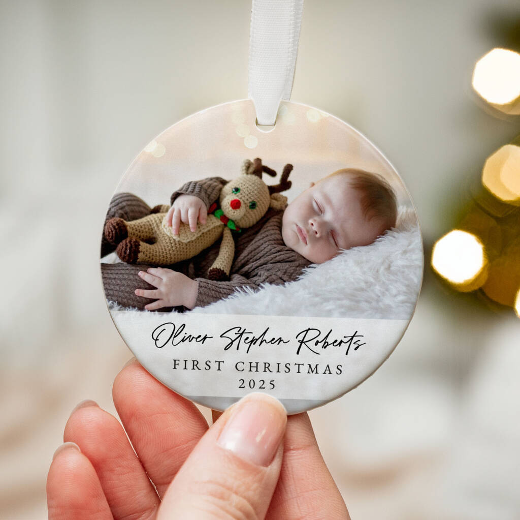 Celebrate Baby's First Christmas with this personalised photo ornament. Perfect baby keepsake gift capturing precious memories forever.
