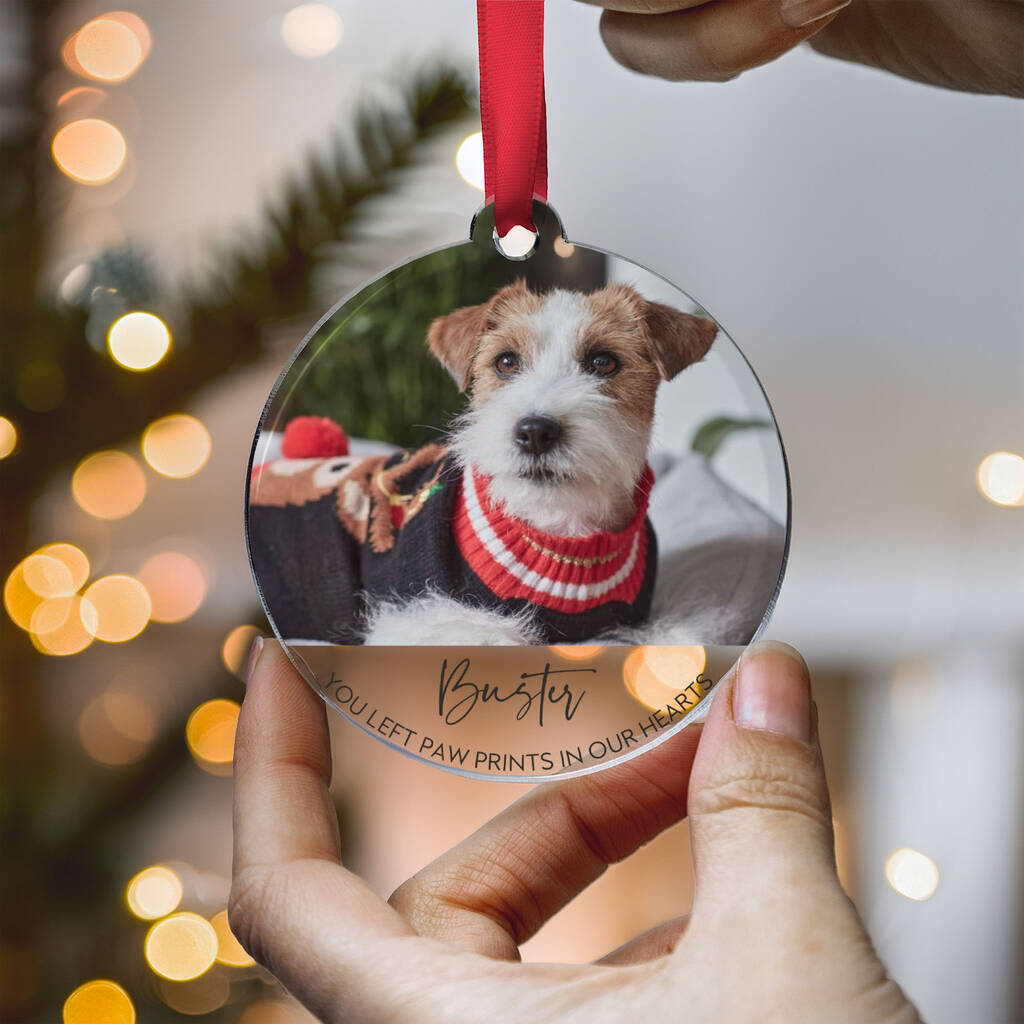 Beautiful personalised ornament for pet memorial occasions. Dog owner keepsake featuring custom pet photos with heartfelt paw prints message.
