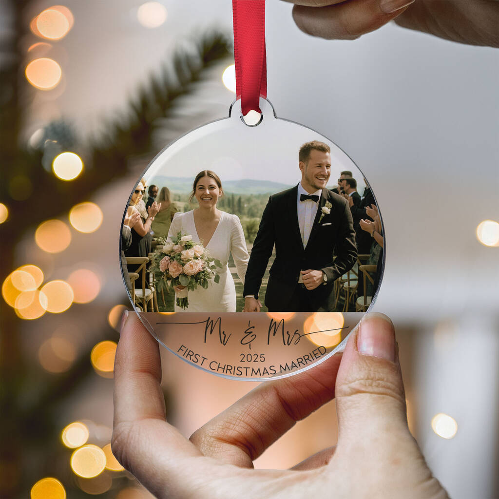 Celebrate your First Christmas Married with this personalised photo ornament. Perfect Mr & Mrs gift capturing your special memories beautifully.