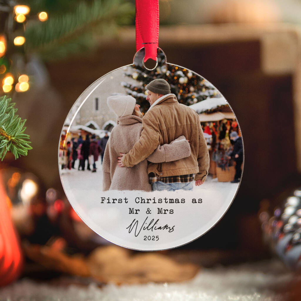 Celebrate your First Christmas Married with this personalised photo ornament. Perfect newlywed gift capturing your special moment as Mr and Mrs.