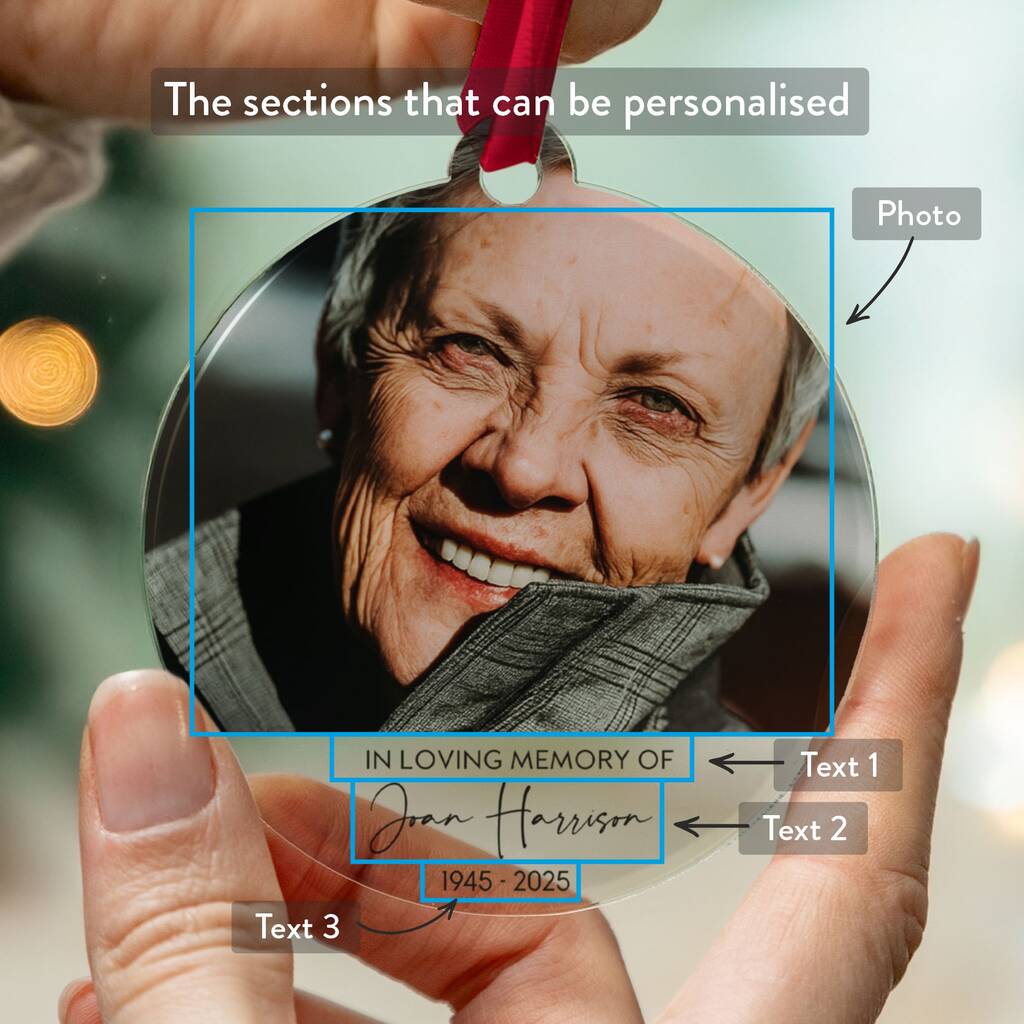 Beautiful memorial keepsake for remembrance occasions. This personalised ornament honours loved ones with cherished photos and meaningful dates.