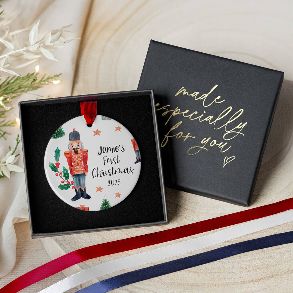 Celebrate Baby's First Christmas with this personalised ceramic bauble keepsake. Perfect thoughtful present for treasuring this special milestone memory.