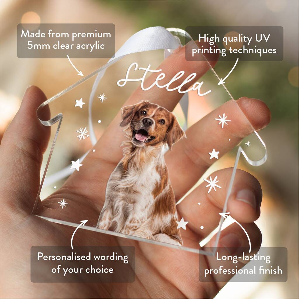 Perfect personalised pet ornament for dog owners. This custom photo keepsake displays your beloved pet's image beautifully.