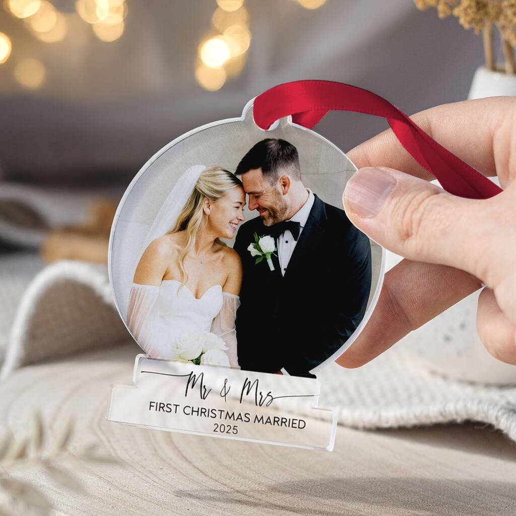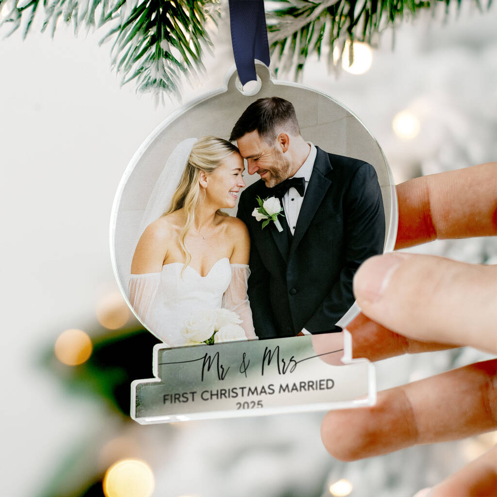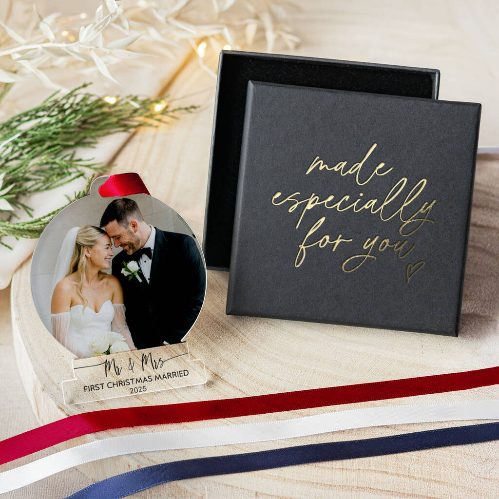 Celebrate your First Christmas Married with this personalised photo ornament. Perfect Mr Mrs gift capturing your romantic memory beautifully.