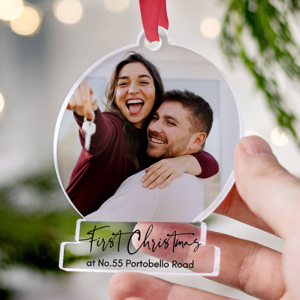 Celebrate your First Christmas together in New Home with this personalised address ornament. Perfect couple housewarming gift capturing milestone memories beautifully.