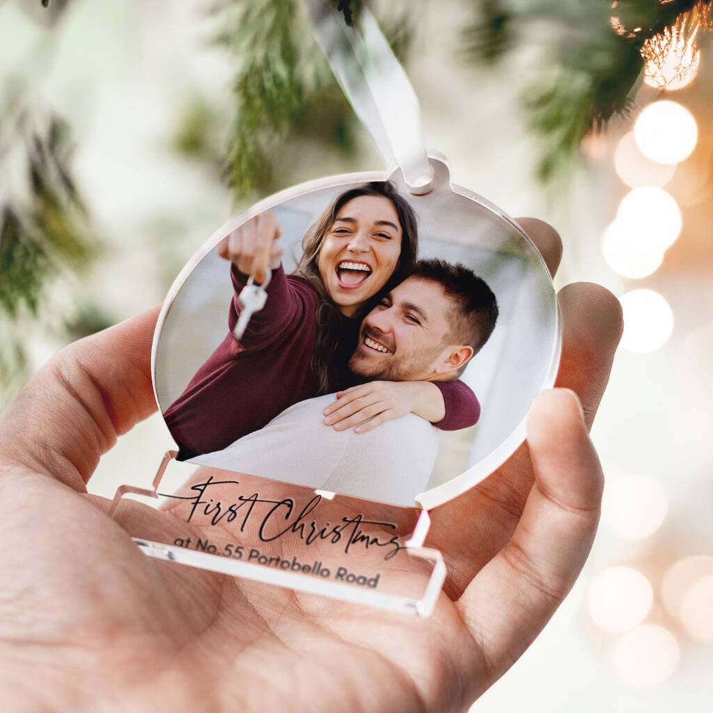 This custom photo bauble creates the perfect First Christmas keepsake for couples starting their journey together in New Home. The handcrafted acrylic construction transforms your precious memories into a premium home decoration that captures this romantic milestone beautifully.