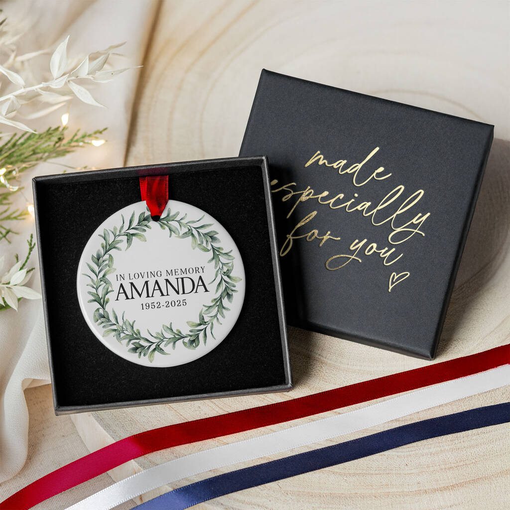 Honour precious memories with this personalised memorial ornament. Perfect remembrance gift featuring custom names and dates for Christmas display.