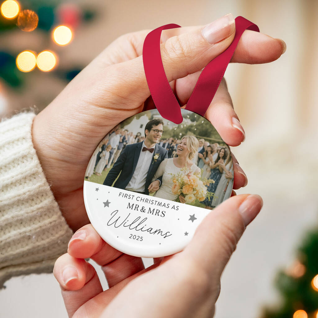 Celebrate your First Christmas married with this personalised ornament featuring your custom photo and newlywed details perfectly displayed.