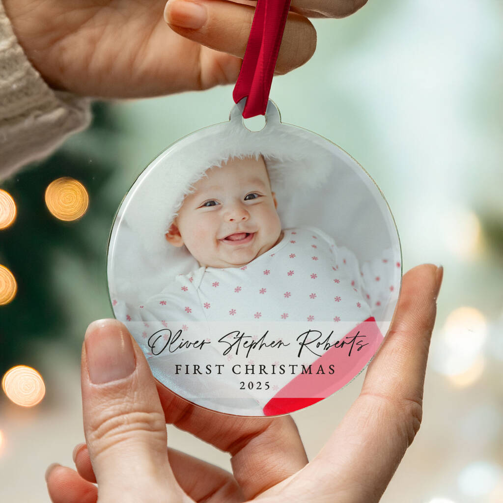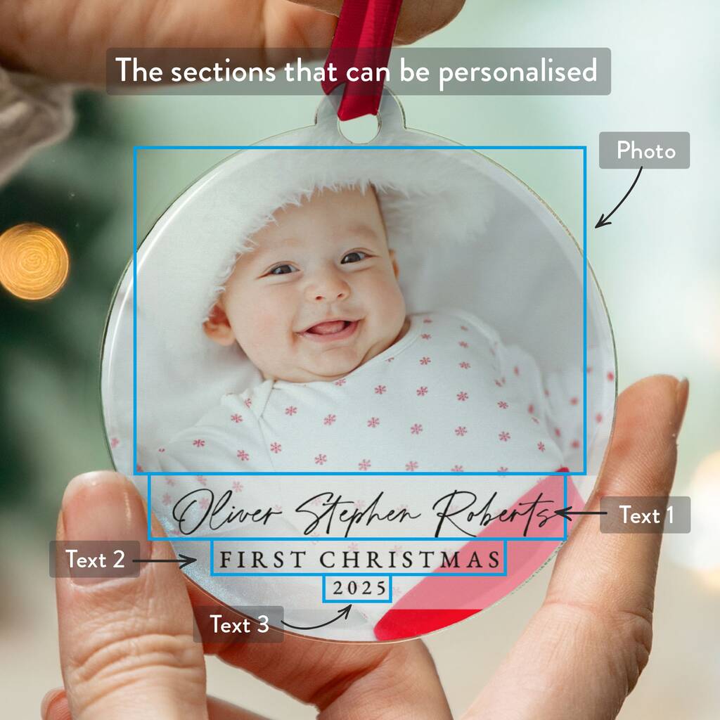 Celebrate Baby's First Christmas with this personalised bauble featuring your treasured photo. Perfect first Christmas keepsake for new parents.