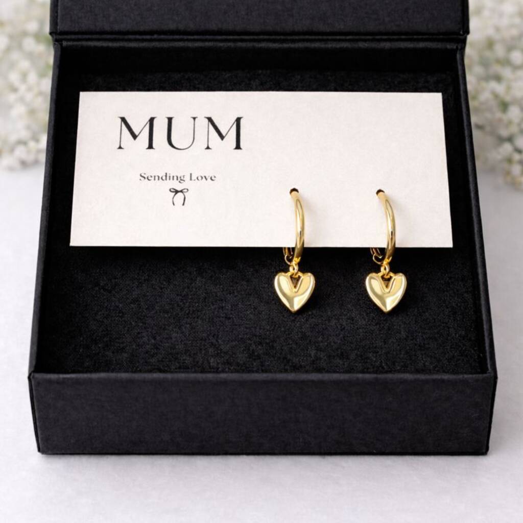 Our stunning Sterling silver base gold heart earrings make the perfect gift for Mum this Mothering Sunday. Complete with a MUM card these heart earrings will make a beautiful gift for her for Birthday and Mothers day.