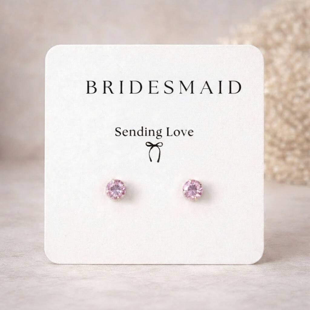 A delicate pair of rose pink crystal stud earrings presented with a personalised “Bridesmaid” Sending Love card the perfect thank you gift for your bridesmaids.A beautiful bridesmaids with a gift they’ll treasure long after the wedding day.