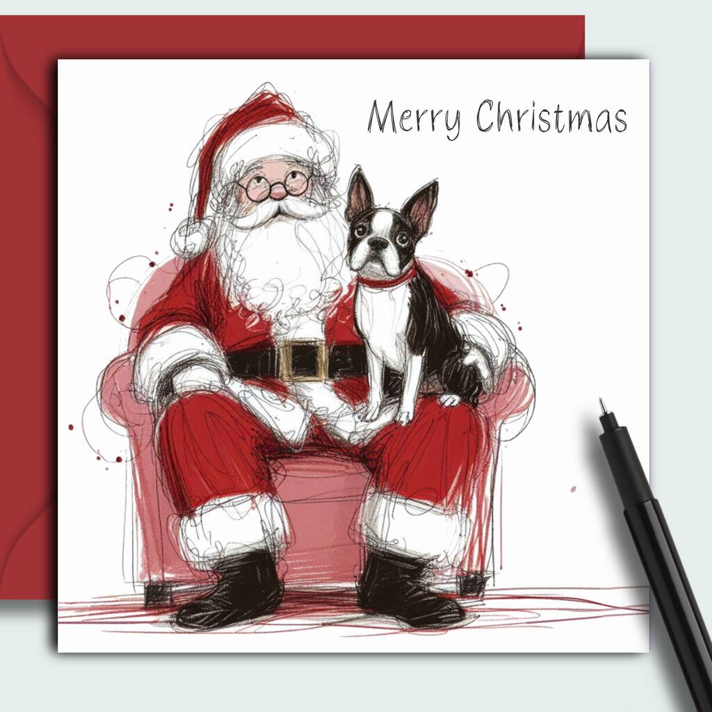 Boston Terrier Dog Christmas Card. Sitting Down With Father Christmas