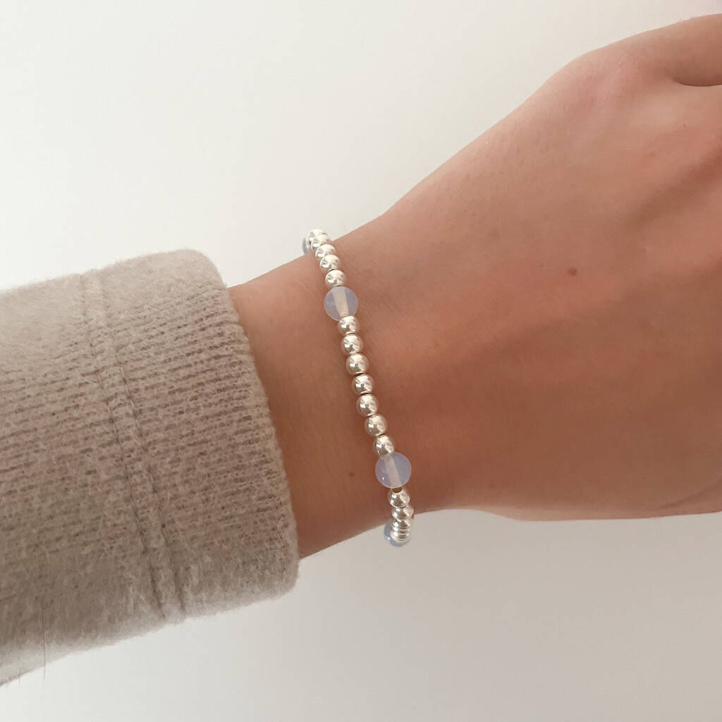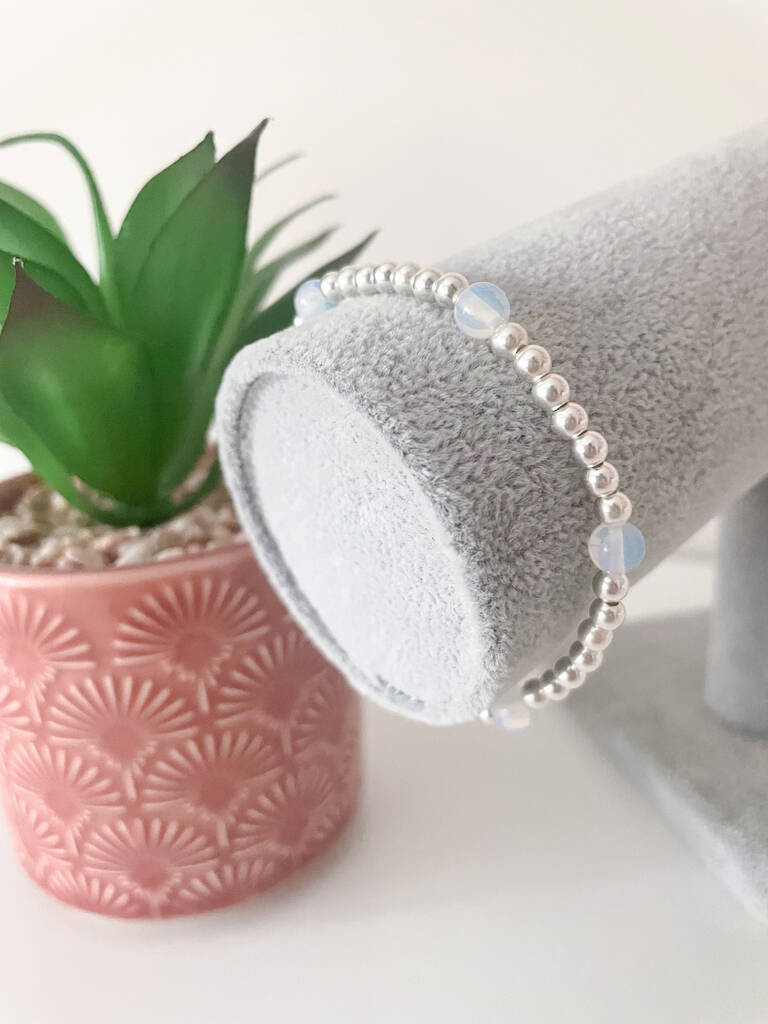 A modern handmade bracelet featuring luminous opalite beads and silver accents, strung on soft elastic for an easy, comfortable fit.