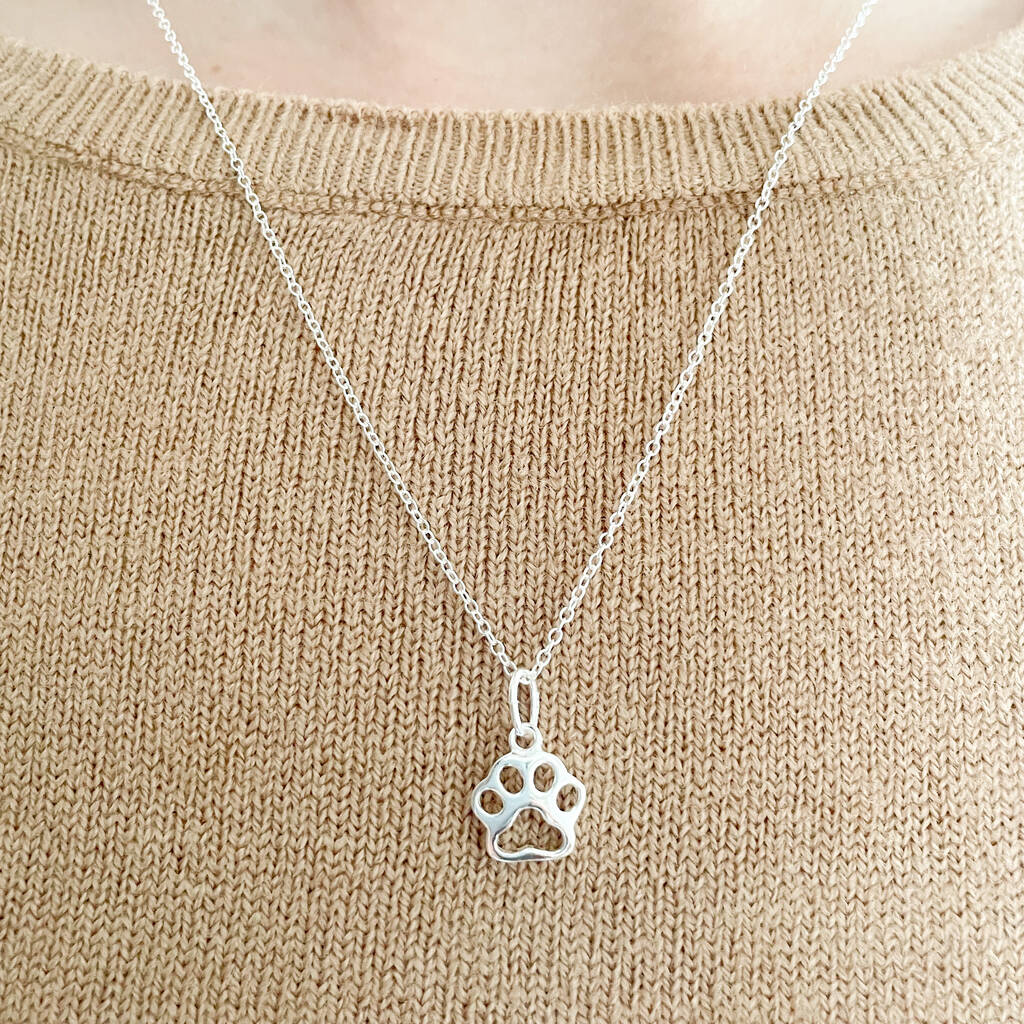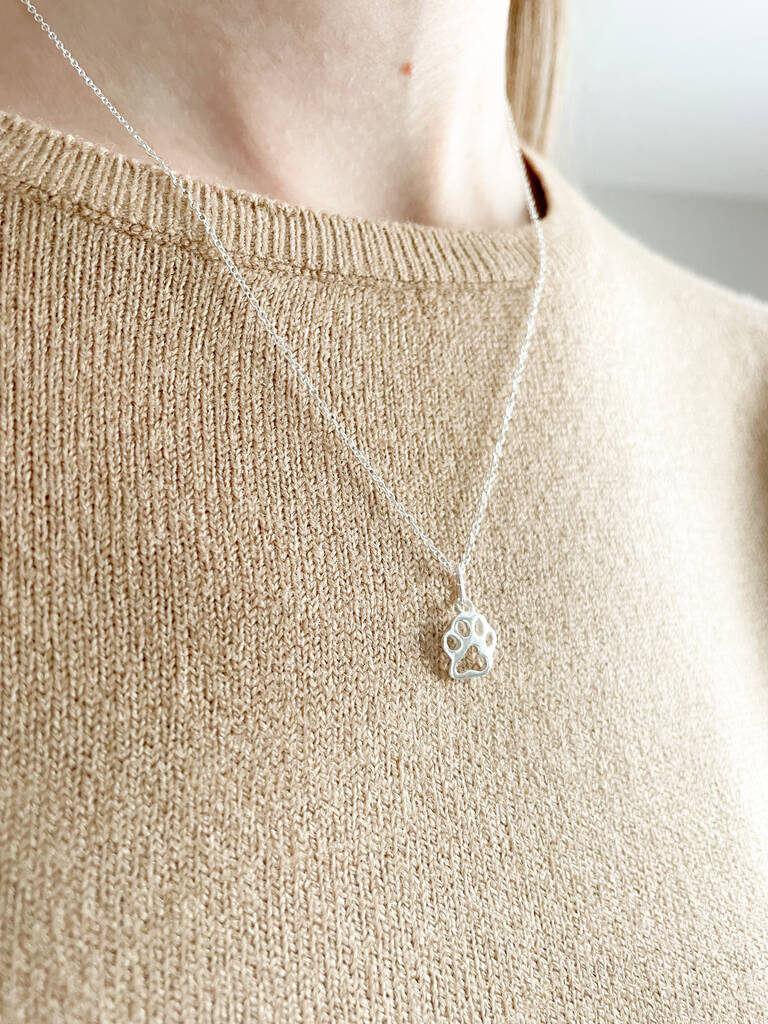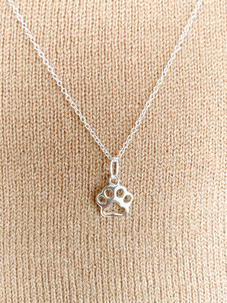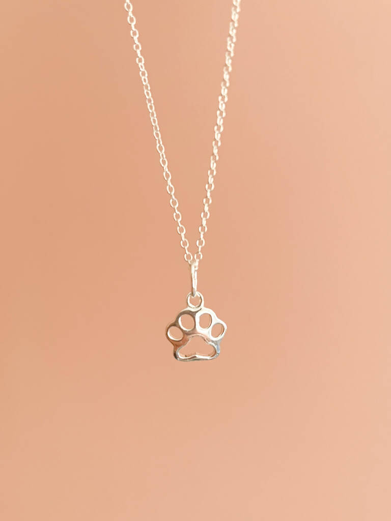 Sterling silver necklace featuring a delicate paw print pendant. A thoughtful gift for animal lovers, pet owners, or anyone who cherishes their furry friends.