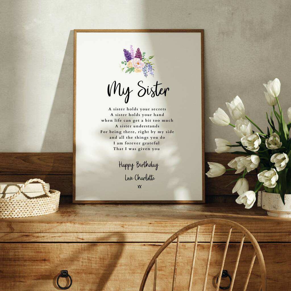 A personalised A4 poem print for a sister, featuring a heartfelt verse and floral design. Customised for any occasion, it’s a meaningful keepsake gift.