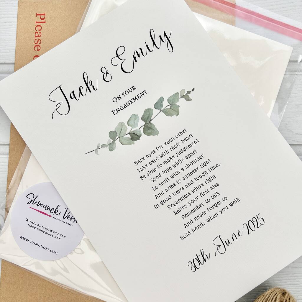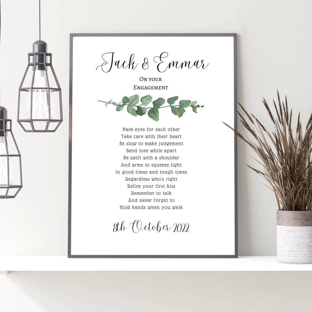 Crafted by Helen Walters at Shmuncki Poem Gifts, this heartfelt verse celebrates togetherness: “Have eyes for each other / Take care with their heart … Hold hands when you walk”. Their names adorn the top in elegant script, with their engagement date beneath the poem for that bespoke touch.