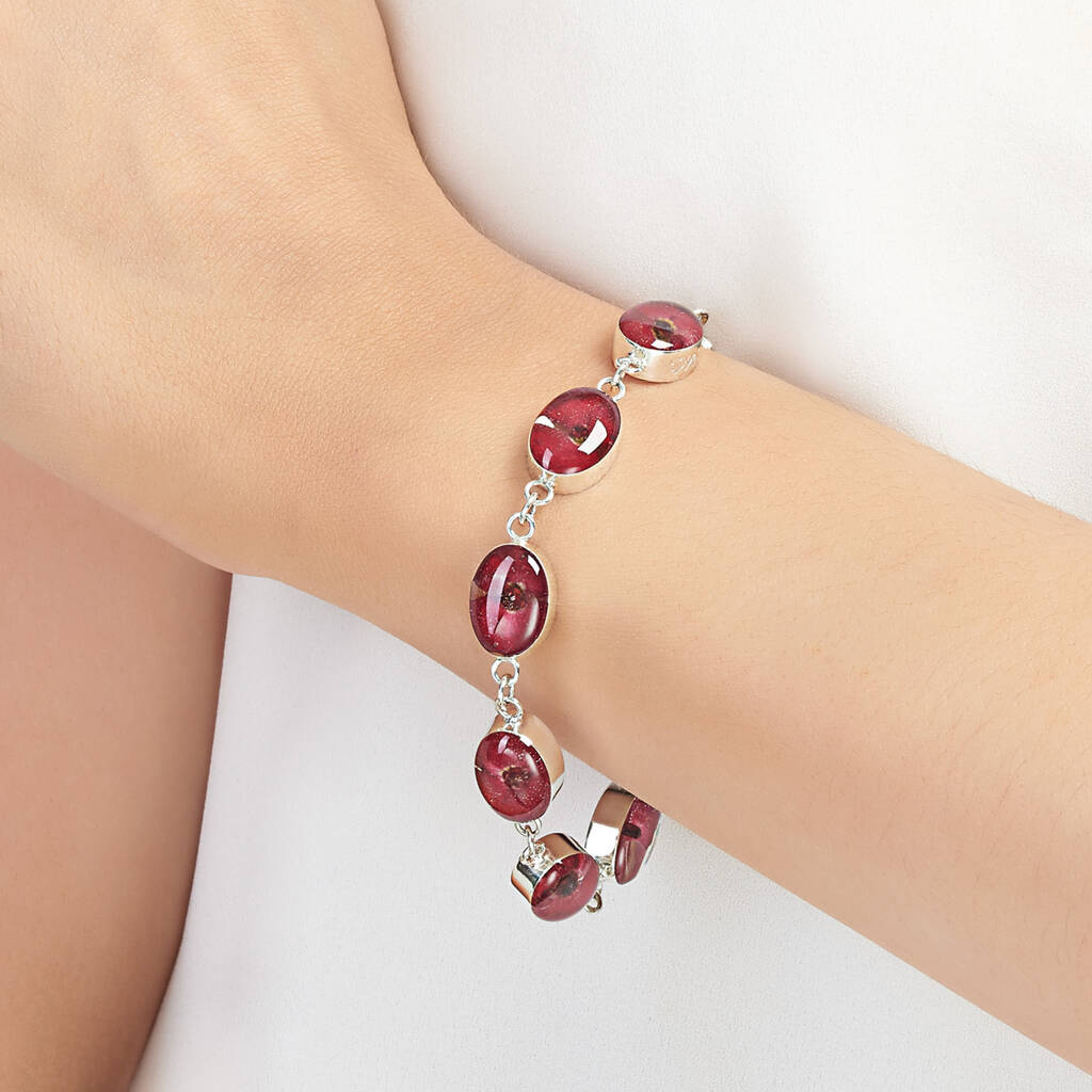 Poppy Bracelet | Sterling Silver Oval Links Bracelet With Real Flowers