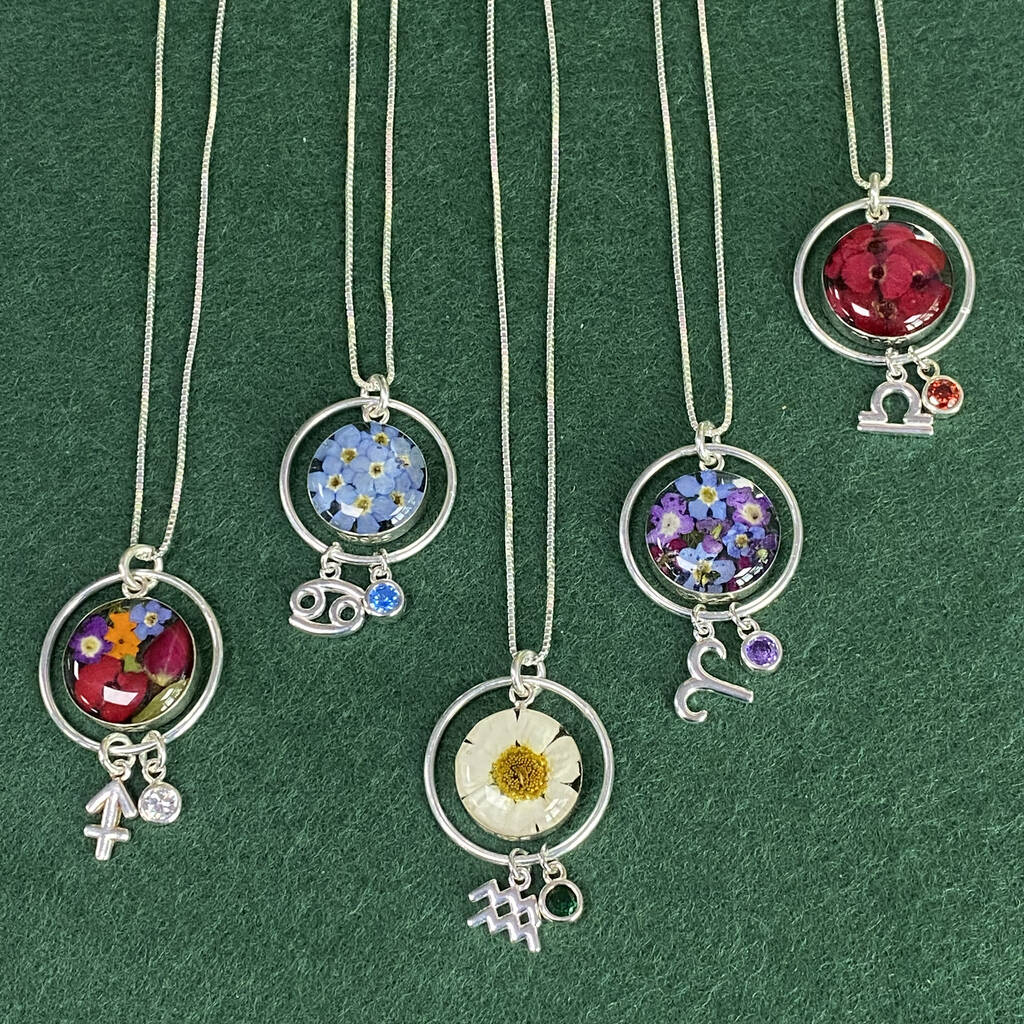 Sterling Silver Handmade Real Flower Necklace With Personalised Birthstone And Zodiac Charm