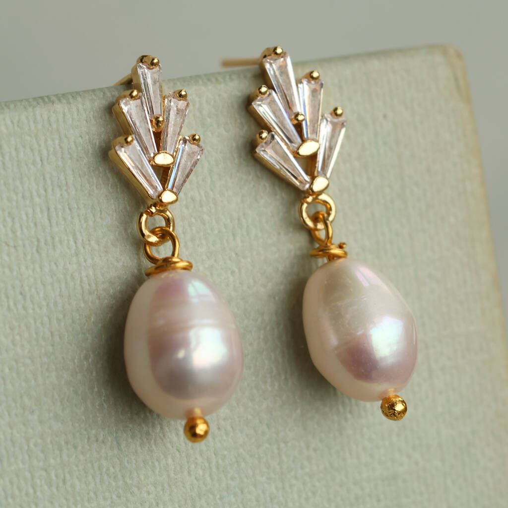 These beautifully detailed art deco earrings feature a stylised crystal geometric design with a single freshwater pearl. The freshwater pearl has a very subltle lilac iridescent colour, which takes on an amazing, beautiful sheen in certain lights.