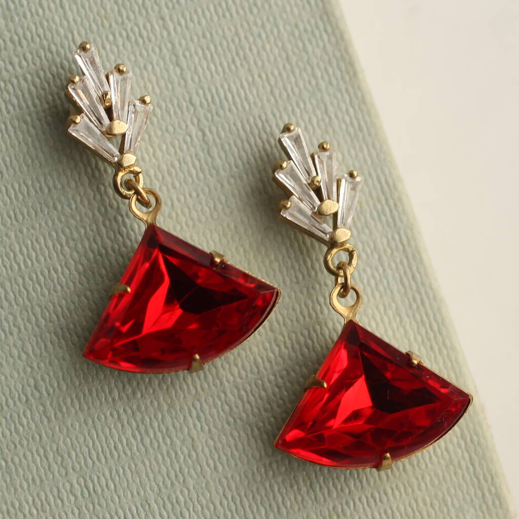 The tiny cubic zirconia jewels are cut into perfect rectangles to form a fan shape. They remind us of classic Deco architecture, like the Chrysler building! The classically cut fan shaped stone is also glass in a beautiful, rich ruby red shade.